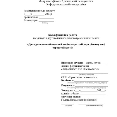 Мета роботи - дослідити особливості копінг-стратегій при різному виді стресостійкості. Досягнення...