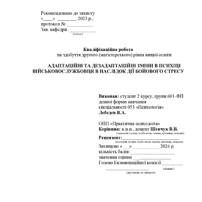 Адаптаційні та дезадаптаційні зміни в психіці військовослужбовця в наслідок дії бойового стресу