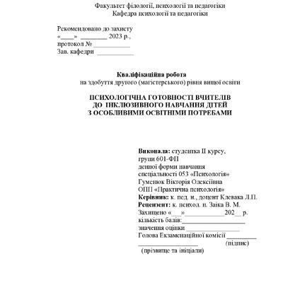 Мета дослідження – теоретично обґрунтувати та експериментально перевірити програму формування психологічної готовності педагогів закладів загальної середньої освіти до інклюзивного навчання дітей з...