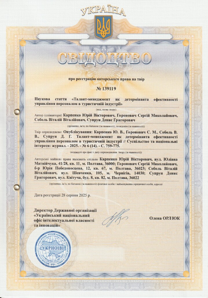 Свідоцтво про реєстрацію авторського права № 139119 на твір «Талант-менеджмент як детермінанта ефективності управління персоналом в туристичній індустрії»