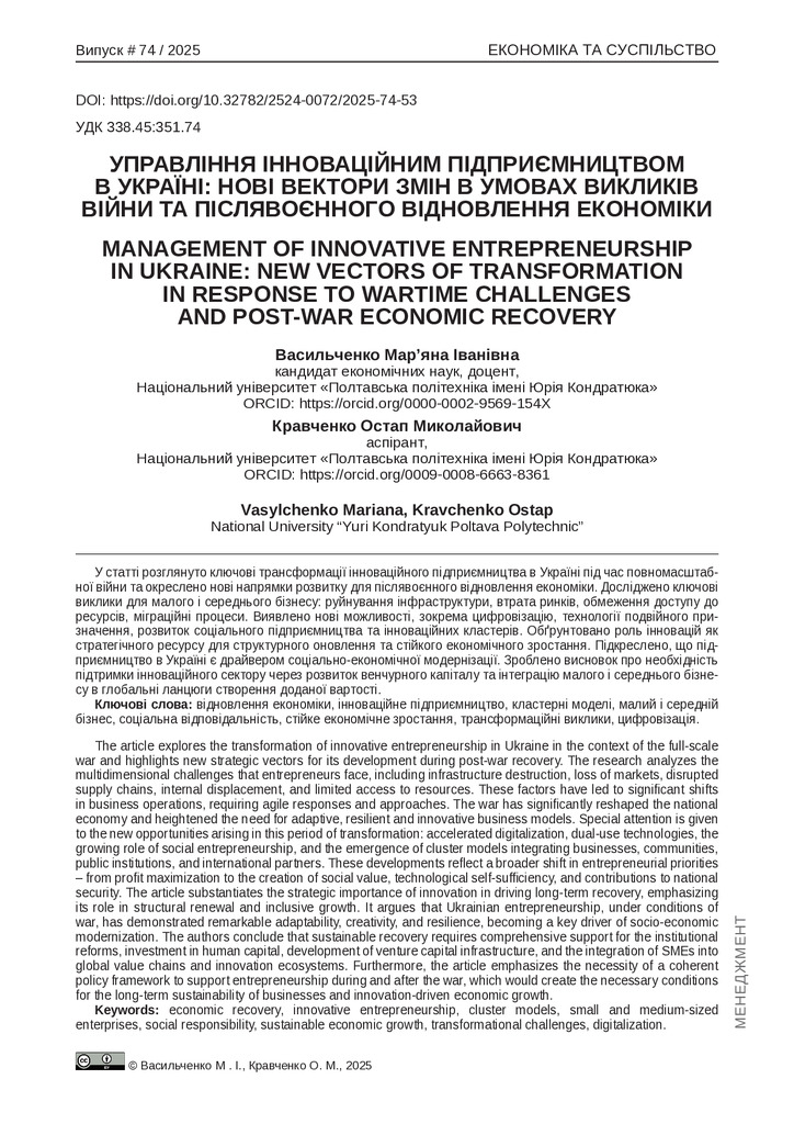 Стаття 2025/12/18Управління інноваційним підприємництвом в Україні: нові вектори змін в умовах викликів війни та післявоєнного відновлення економіки