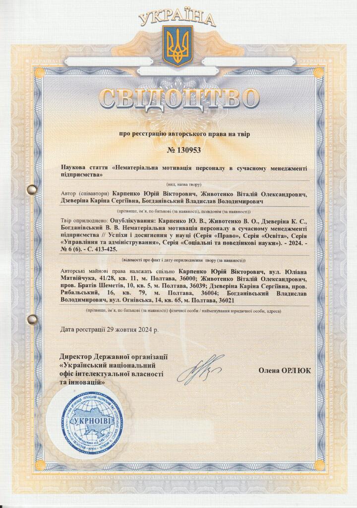 Стаття 2025/12/09Свідоцтво про реєстрацію авторського права № 130953 на твір «Нематеріальна мотивація персоналу в сучасному менеджменті підприємства»