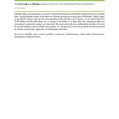 Стаття 2025/12/15Geodetic monitoring of the Kaniv HPP dam using satellite radar