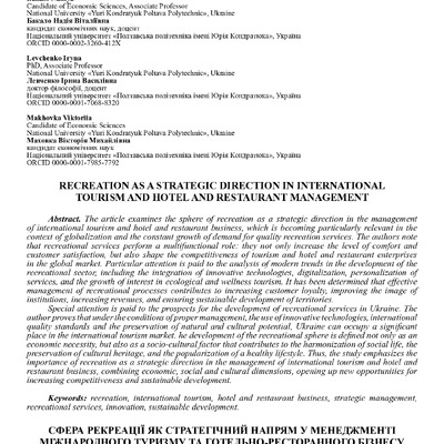 The article examines the sphere of recreation as a strategic direction in the management of international tourism and hotel and restaurant business, which is becoming particularly relevant in the c...