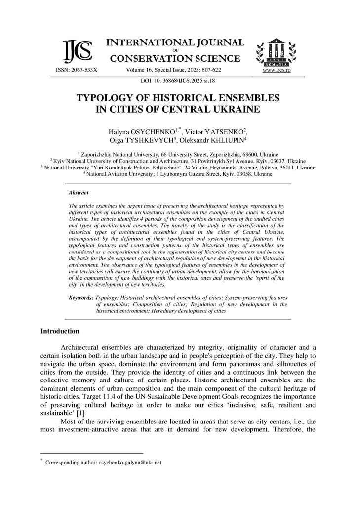 The article examines the urgent issue of preserving the architectural heritage represented by different types of historical architectural ensembles on the example of the cities in Central Ukraine. ...