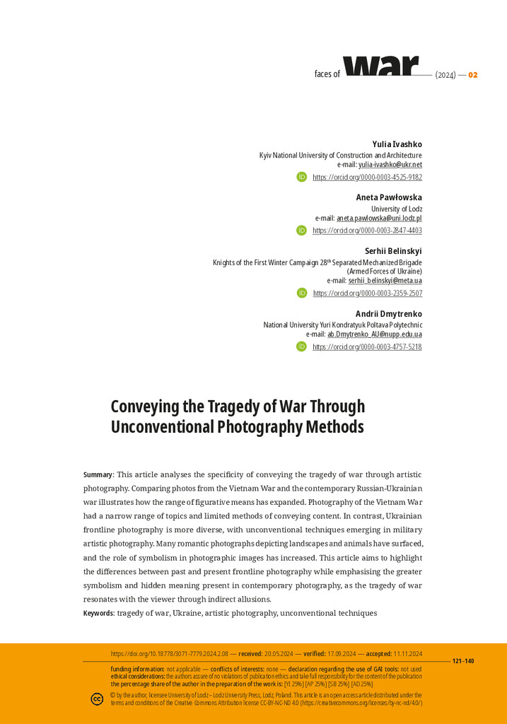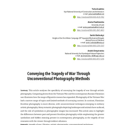 У цій статті аналізується специфіка передачі трагедії війни через художню фотографію. Порівняння фотографій часів війни у В'єтнамі та сучасної російсько-української війни ілюструє, як розширився ді...