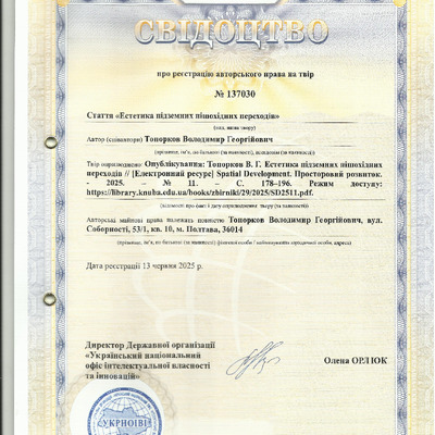 Стаття 2025/08/04Свідоцтво про реєстрацію авторського права № 137030 на твір «Естетика підземних пішохідних переходів»