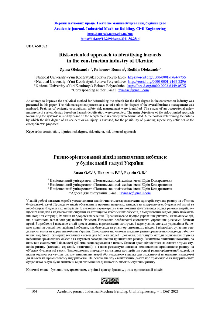 Стаття 2023/01/12Risk-oriented approach to identifying hazards in the construction industry of Ukraine