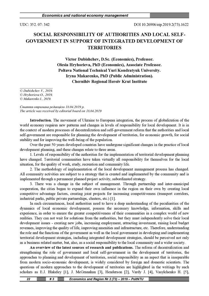 Стаття 2023/07/12Social Responsibility of Authorities and Local Self-Government in Support of Integrated Development of Territories