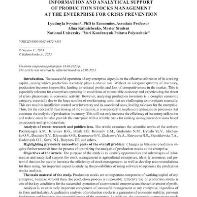 Стаття 2023/08/17Information and analytical support of production stocks management at the enterprise for crisis prevention