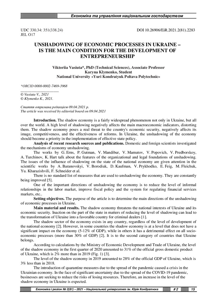 Стаття 2022/02/07Unshadowing of Economic Processes in Ukraine – is the Main Condition for the Development of Entrepreneurship