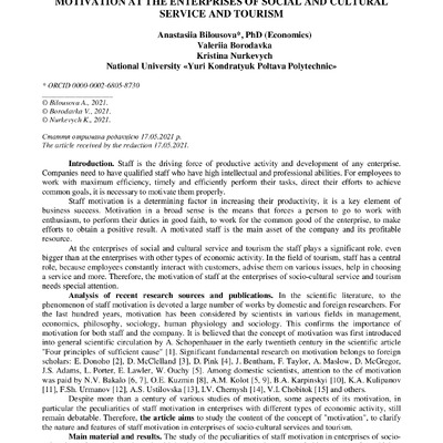 Стаття 2022/02/15The Theoretical Basis of the System of Staff Motivation at the Enterprises of Social and Cultural Service and Tourism