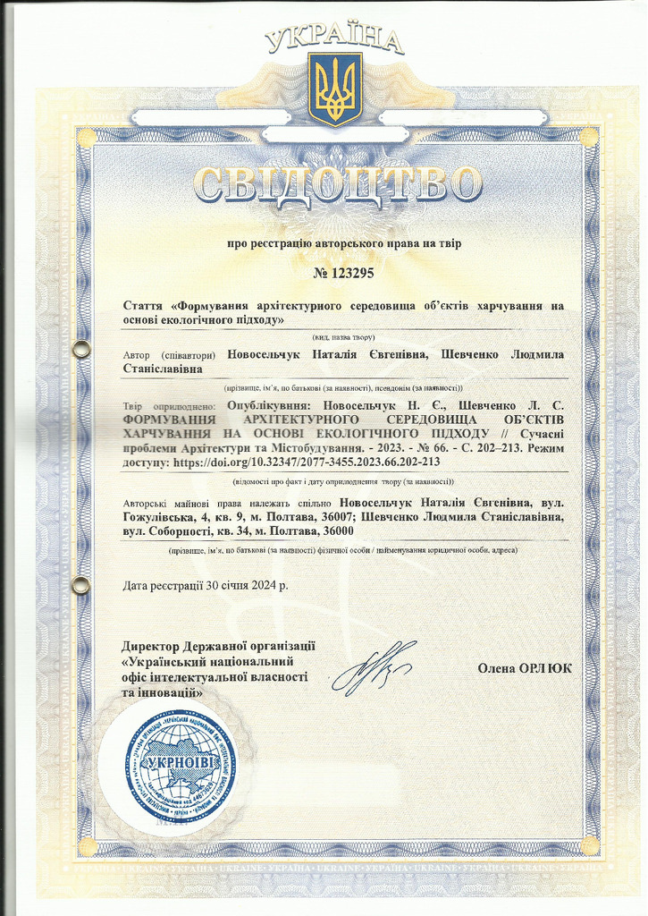 Стаття 2025/08/28Свідоцтво про реєстрацію авторського права № 123295 Україна на твір «Формування архітектурного середовища об'єктів харчування на основі екологічного підходу»