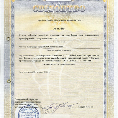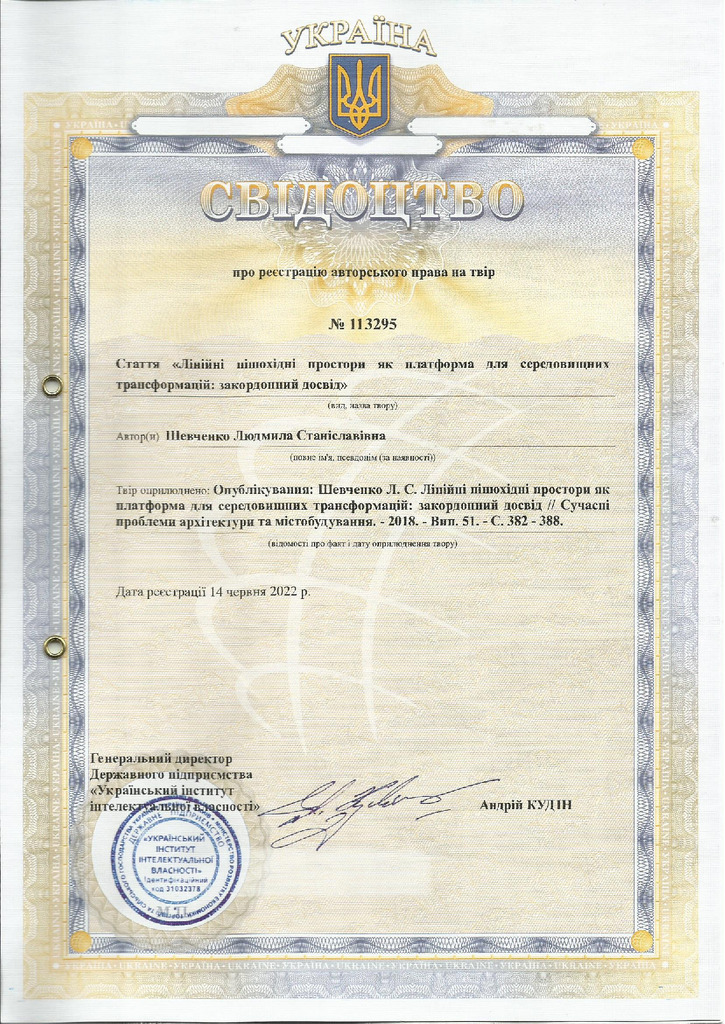 Свідоцтво про реєстрацію авторського права № 113295 Україна на твір «Лінійні пішохідні простори як платформа для середовищних трансформацій: закордонний досвід»