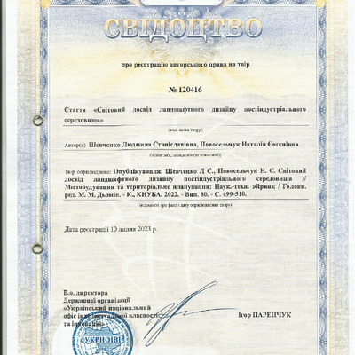 Стаття 2025/08/28Свідоцтво про реєстрацію авторського права № 120416 Україна на твір «Світовий досвід ландшафтного дизайну постіндустріального середовища»