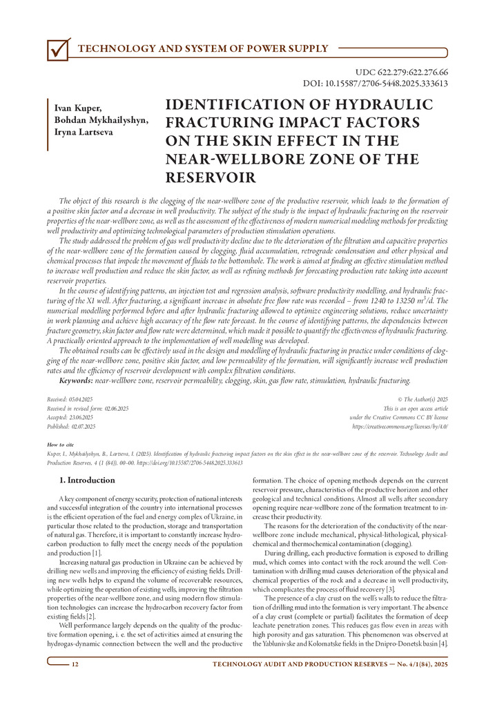 Стаття 2025/12/05Identification of hydraulic fracturing impact factors on the skin effect in the near-wellbore zone of the reservoir