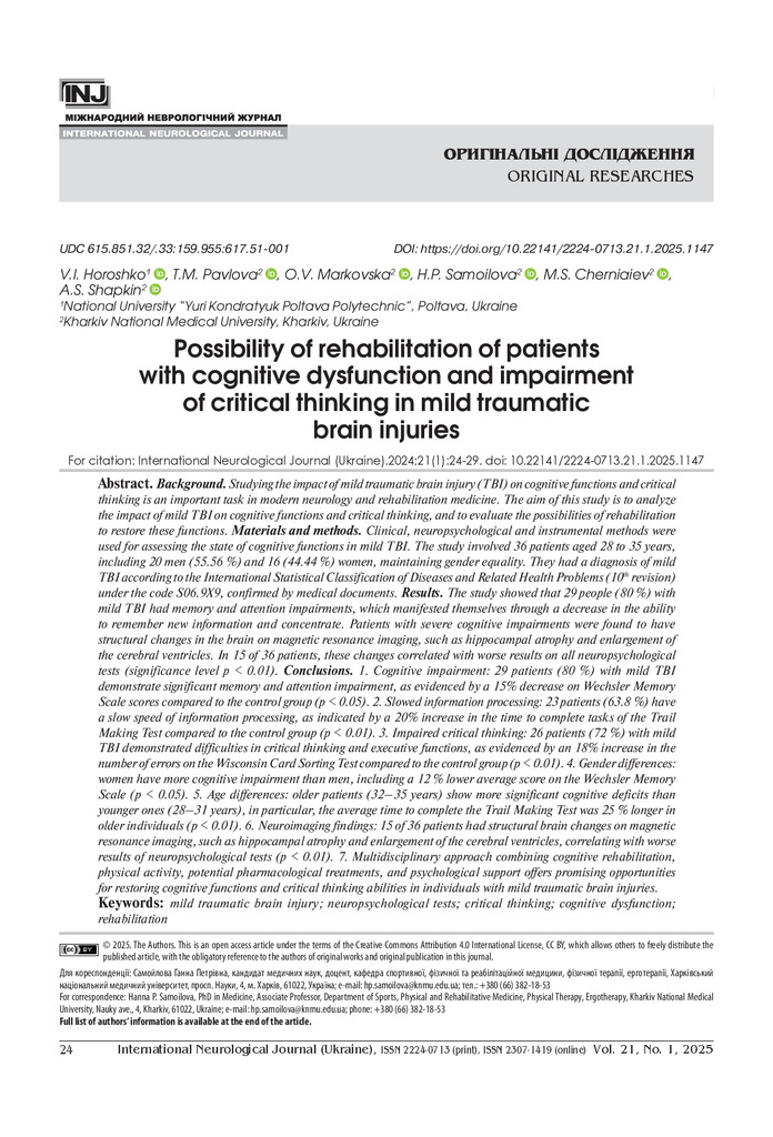 Стаття 2025/06/10Possibility of rehabilitation of patients with cognitive dysfunction and impairment of critical thinking in mild traumatic brain injuries
