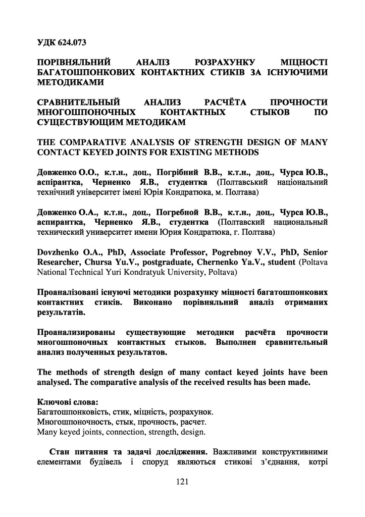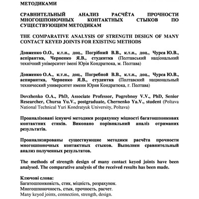 Стаття 2020/07/02Порiвняльний аналiз розрахунку мiцностi багатошпонкових контактних стиків за існуючими методиками