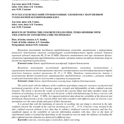 Викладено результати досліджень трубобетонних елементів, виготовлених з порушеннями технології бе...