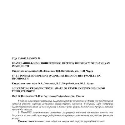 Здійснено дослідження шпонкових стиків бетонних і залізобетонних елементів шляхом застосування фі...