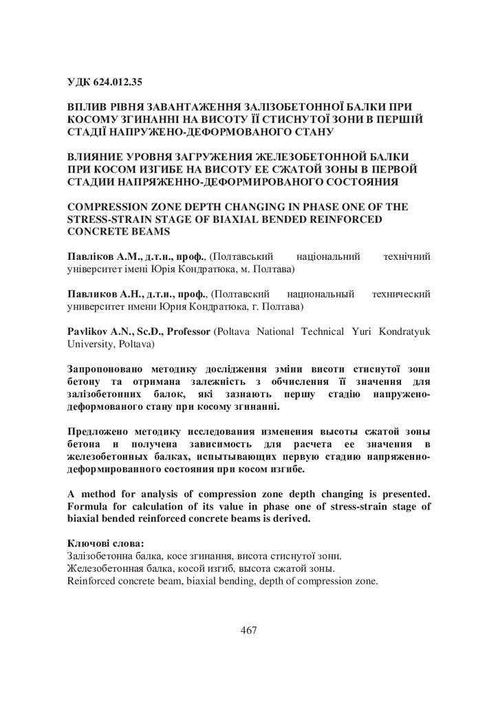 Стаття 2020/06/16Вплив рівня завантаження залізобетонної балки при косому згинанні на висоту її стиснутої зони в першій стадії напружено-деформованого стану