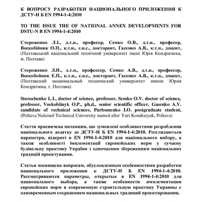 Стаття присвячена питанням, що зумовлені особливостями розроблення національного додатку до ДСТУ-Н Б EN 1994-1-4:2010. Розглядаються параметри, відкриті в EN 1994-1-4:2010 для національного вибору,...