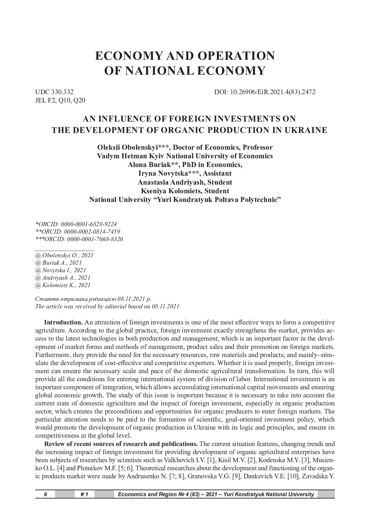 Obolenskyi O. An influence of foreign investments on the development of organic production in Ukraine / O. Obolenskyi, A. Buryak, I. Novytska [et al.] // Економіка і регіон. – 2021. – № 4 (83). – С. 6–12. – DOI: 10.26906/EiR.2021.4(83).2472.