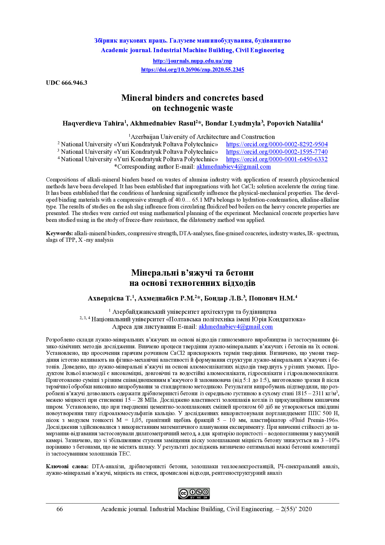 Mineral binders and concretes based on technogenic waste / Haqverdieva Tahira, Akhmednabiev Rasul, Bondar Lyudmyla, Popovich Nataliia // Збірник наукових праць. Галузеве машинобудування, будівництво. – 2020. – № 2 (55). – С. 66-75.