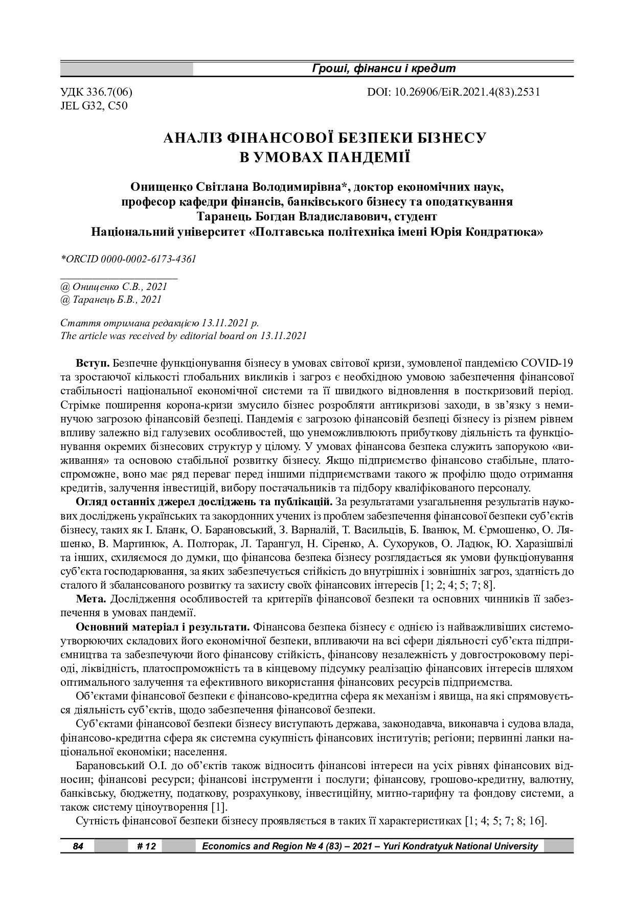 Аналіз фінансової безпеки бізнесу в умовах пандемії