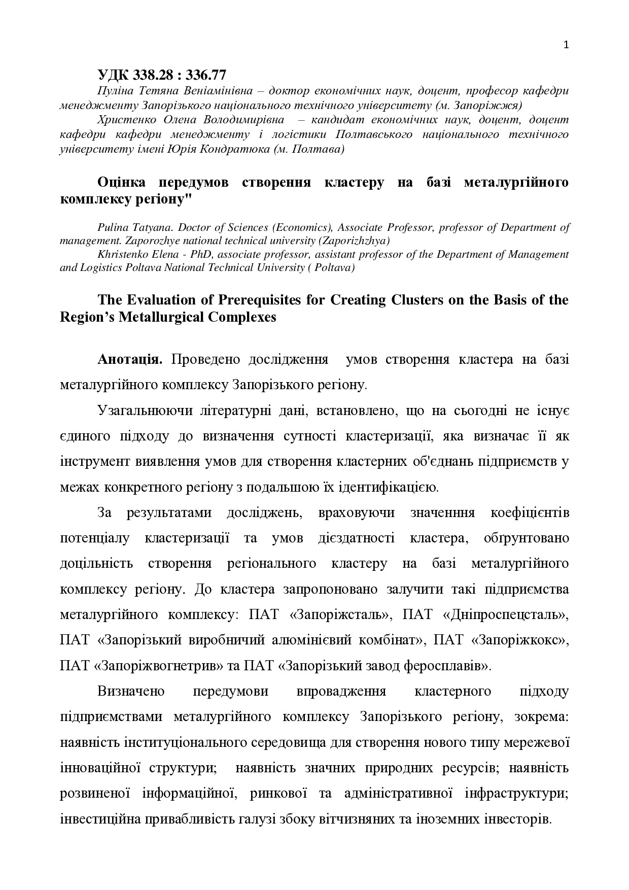 Оцінка передумов створення кластеру на базі металургійного комплексу регіону