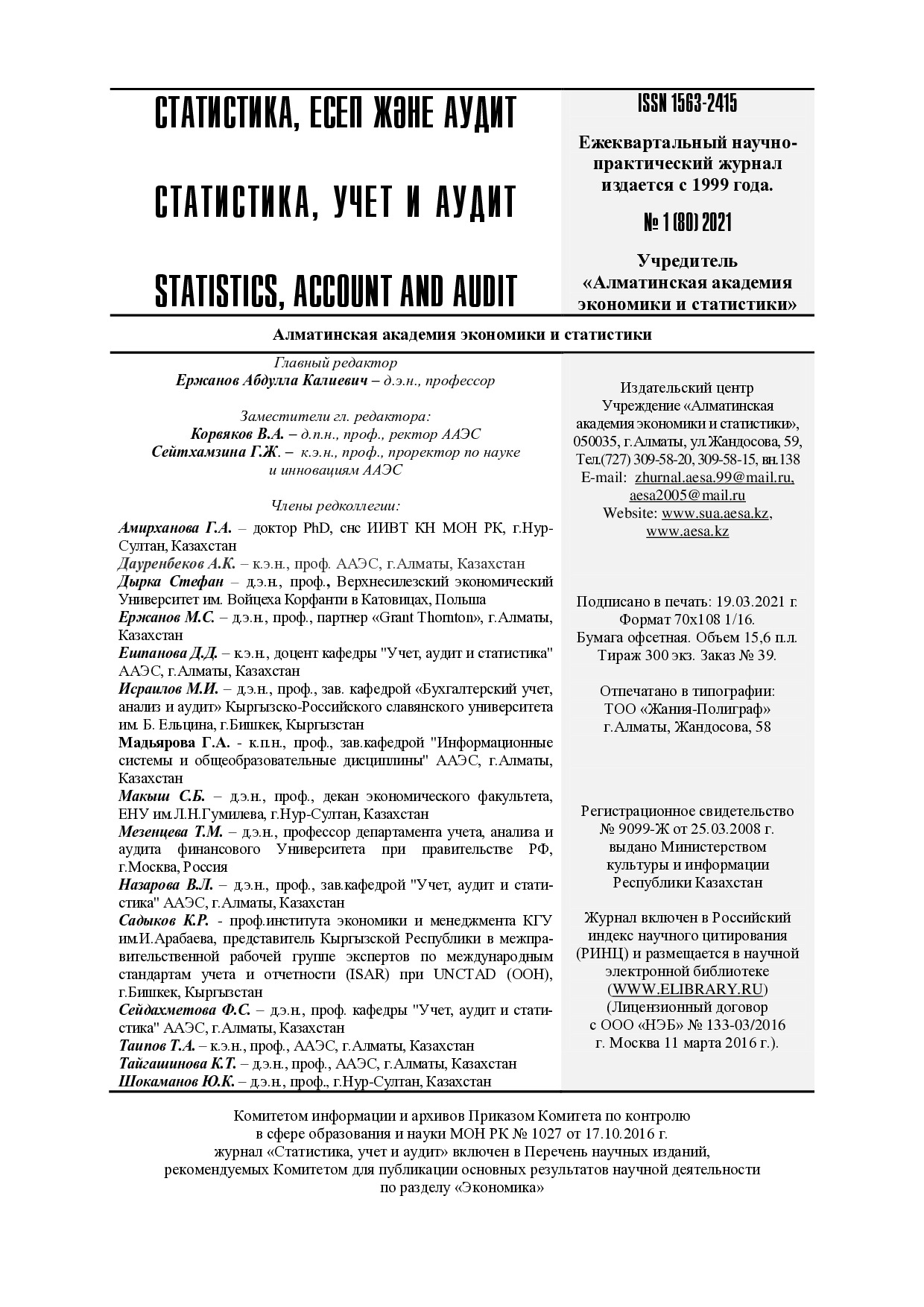 Расчеты временных разниц и учет отсроченного налога / Р.Н. Нургалиева, С.Т. Миржакыпова, Ю.А. Верига, Е.В. Коба // Статистика, учет и аудит. – 2021. – № 1. – С. 21-25. – https://doi.org/10.51579/1563-2415.2021-1.04