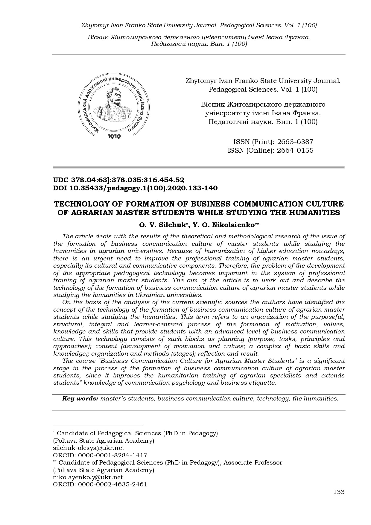 Technology of formation of business communication culture of agrarian master students while studying the humanities