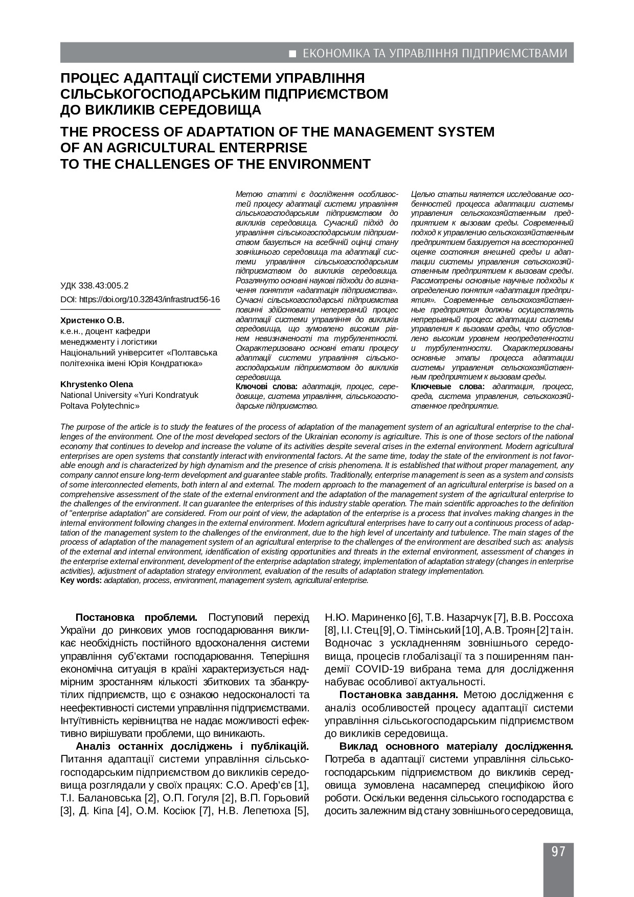 Процес адаптації системи управління сільськогосподарським підприємством до викликів середовища