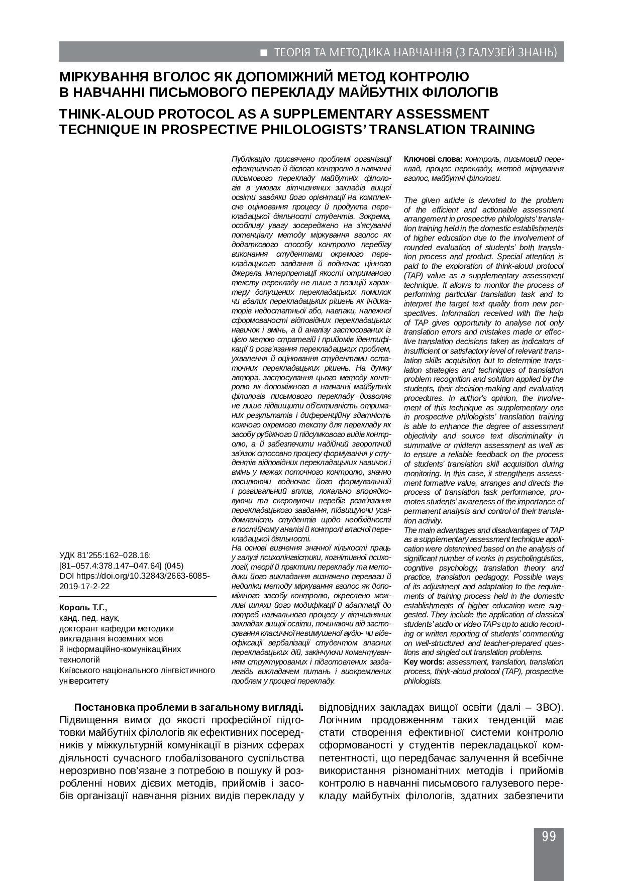Міркування вголос як допоміжний метод контролю в навчанні письмового перекладу майбутніх філологів