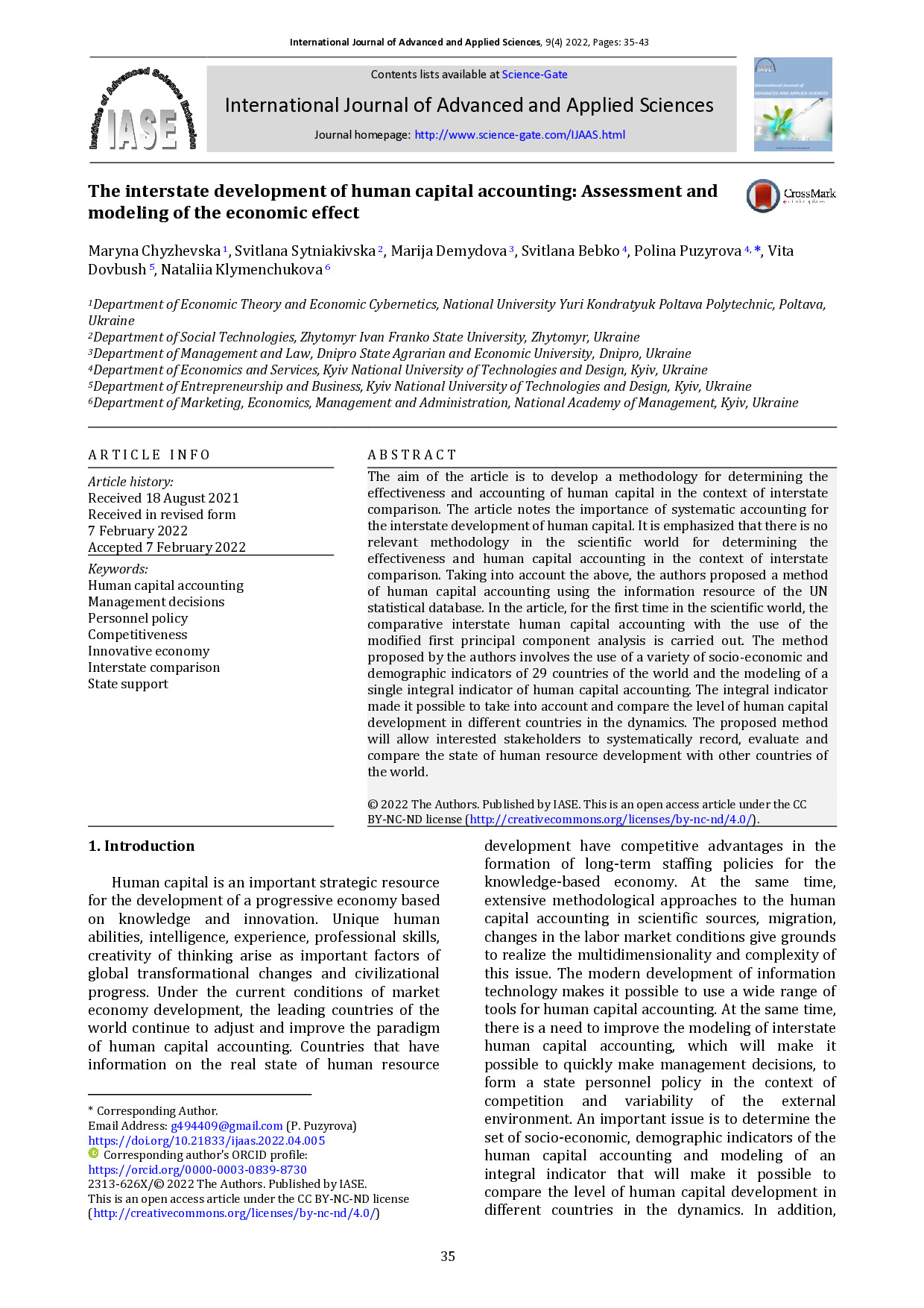 The interstate development of human capital accounting: Assessment and modeling of the economic effect / M.B. Chyzhevska, S.M. Sytniakivska, M.M. Demydova [et al.] // International Journal of Advanced and Applied Sciences.– 2022. – Vol. 9, Iss. 4. – P. 35-43.