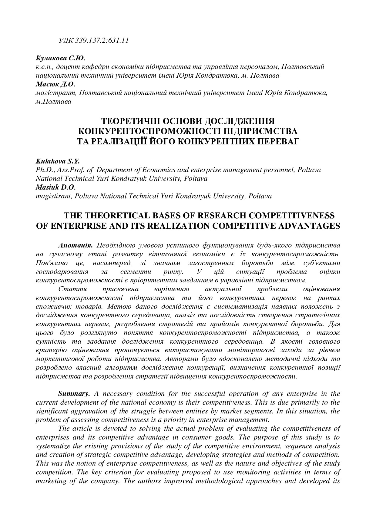 Теоретичні основи дослідження конкурентоспроможності підприємства та реалізації його конкурентних переваг