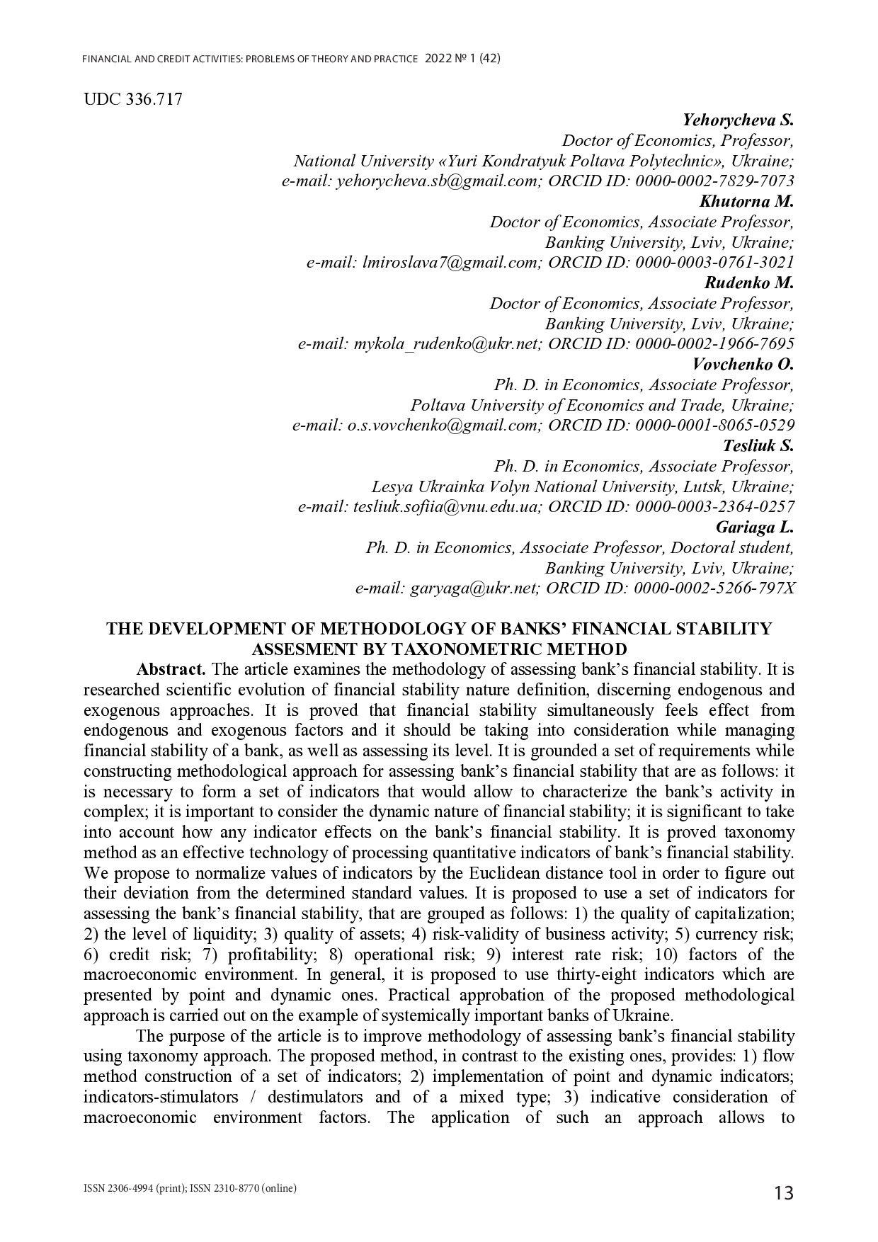 The development of methodology of banks’ financial stability assesment by taxonometric method / S. Yehorycheva, М. Khutorna, M. Rudenko, O. Vovchenko, S.Tesliuk, L. Gariaga // Фінансово-кредитна діяльність: проблеми теорії і практики. – 2022. – № 1. – С. 13-25.