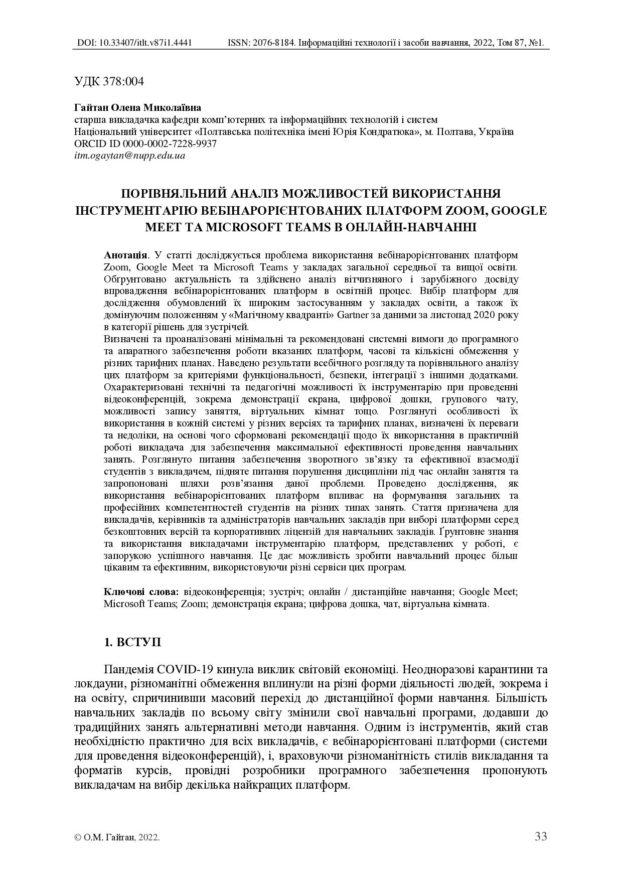 Порівняльний аналіз можливостей використання інструментарію вебінарорієнтованих платформ Zoom, Google Meet та Microsoft Teams в онлайн-навчанні