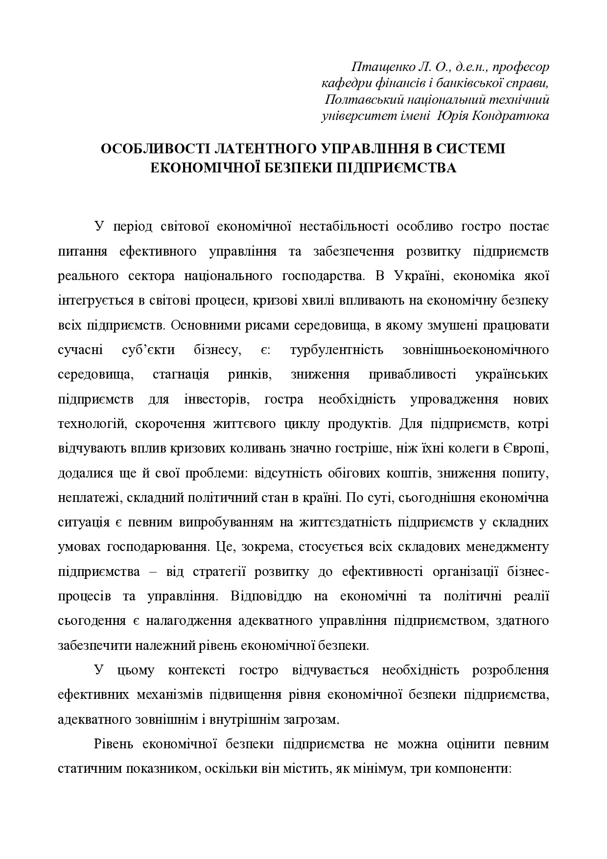 Особливості латентного управління в системі економічної безпеки підприємства