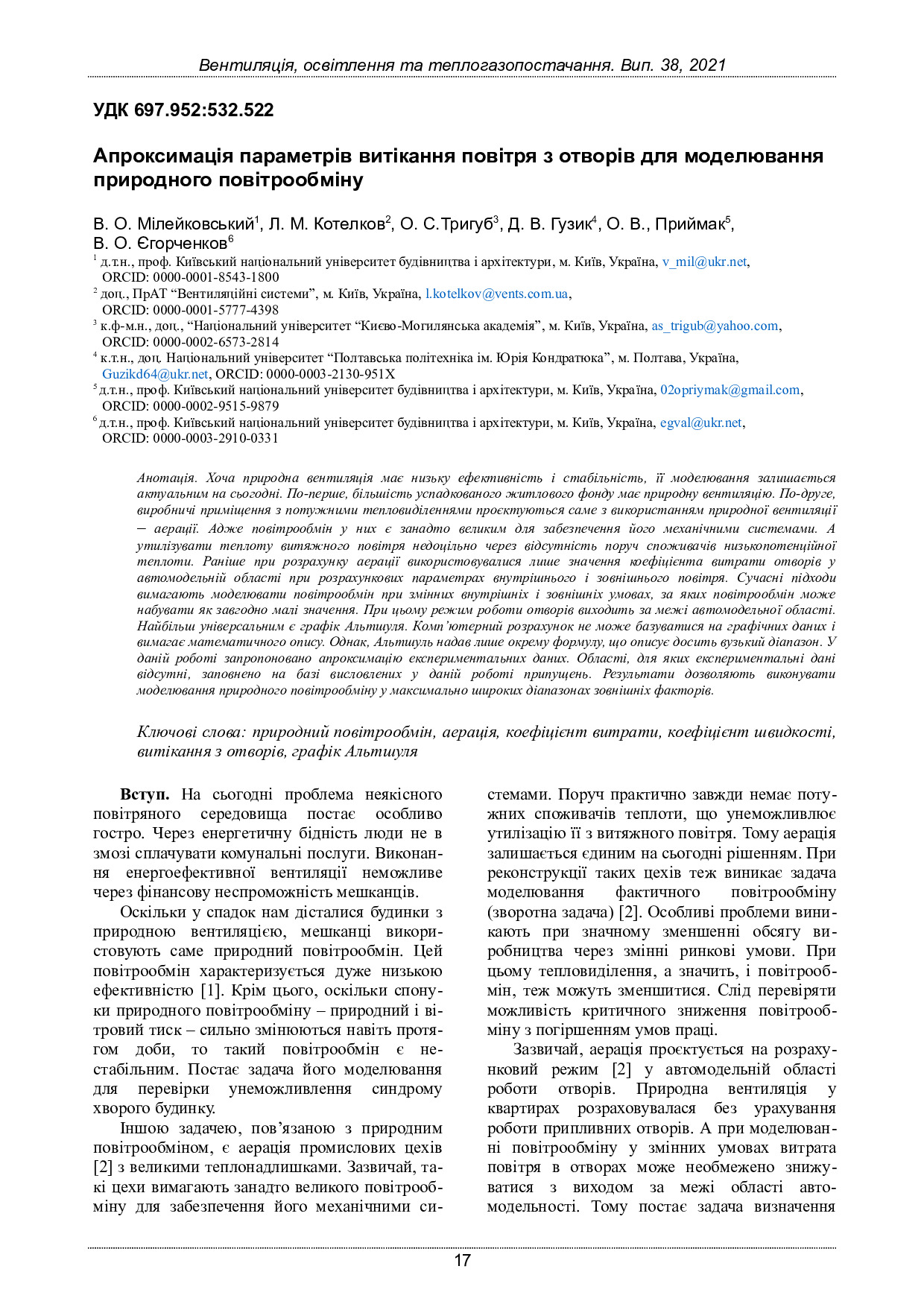 Апроксимація параметрів витікання повітря з отворів для моделювання природного повітрообміну