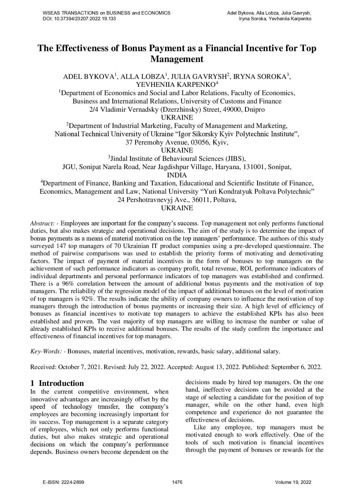 The effectiveness of bonus payment as a financial incentive for top management / A. Bykova, A. Lobza, J. Gavrysh, I. Soroka, Y. Karpenko // WSEAS Transactions on Business and Economics. – 2022. – Vol. 19, Iss. 22. – P. 1476-1492. – DOI:10.37394/23207.2022.19.133