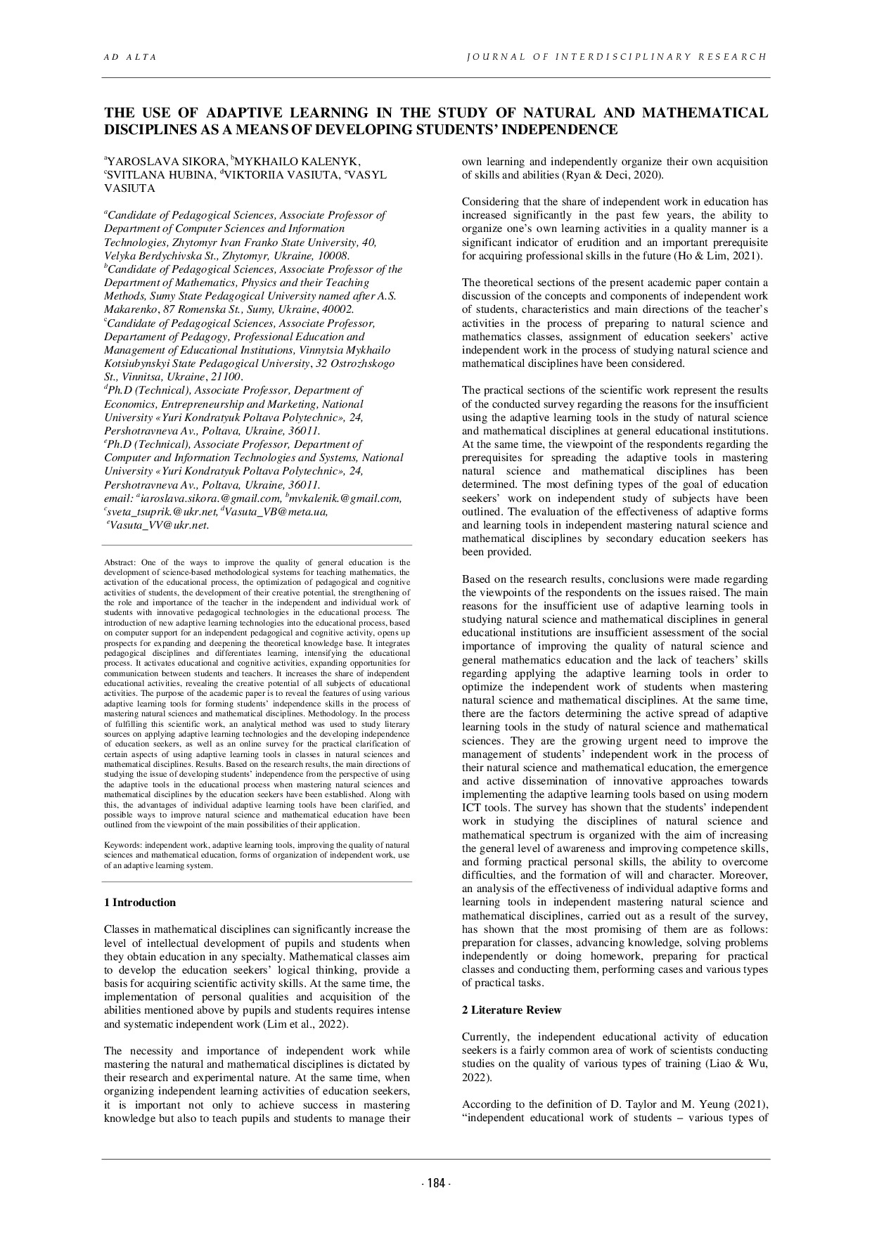 The use of adaptive learning in the study of natural and mathematical disciplines as a means of developing students' independence