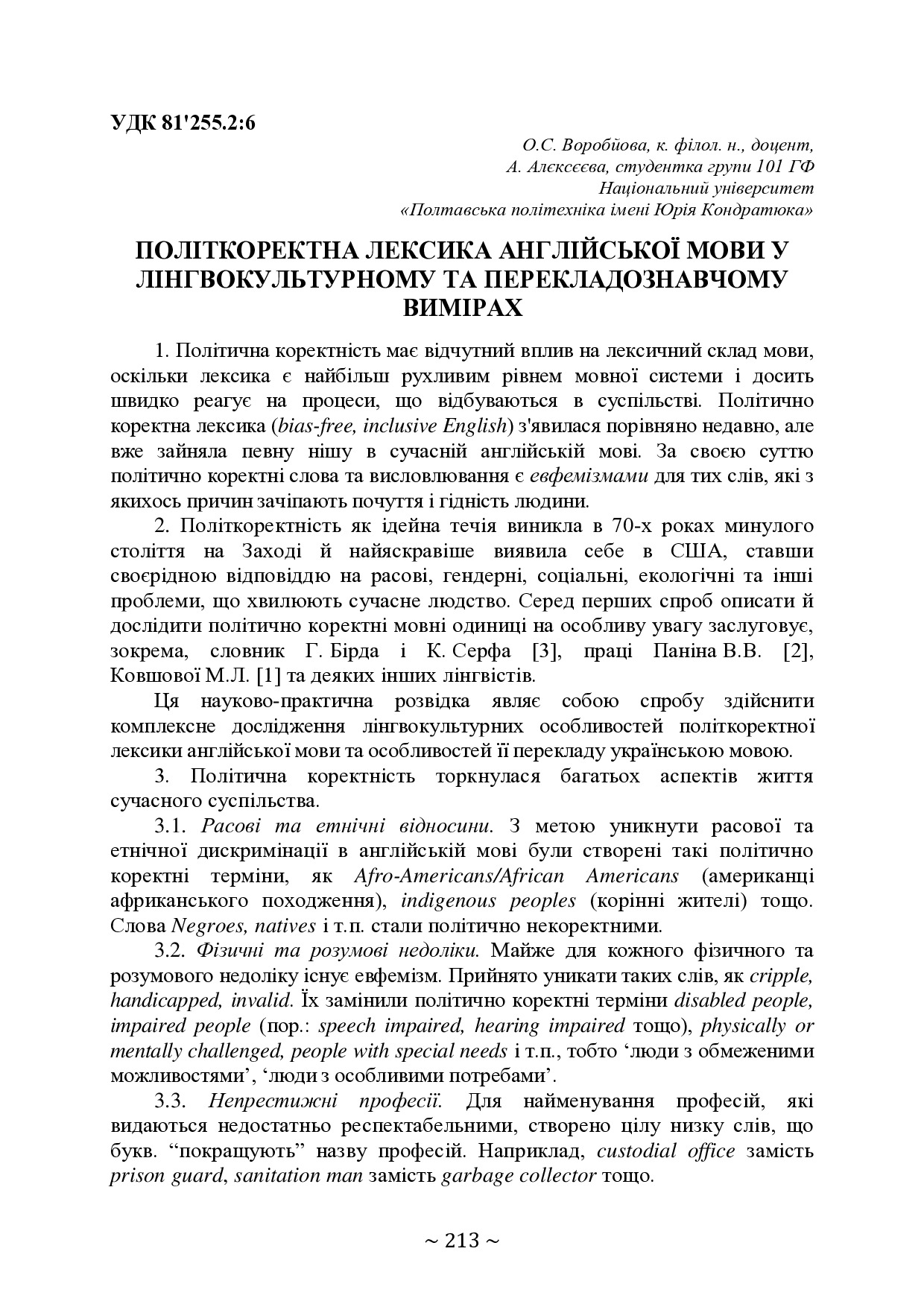 Політкоректна лексика англійської мови у лінгвокультурному та перекладознавчому вимірах