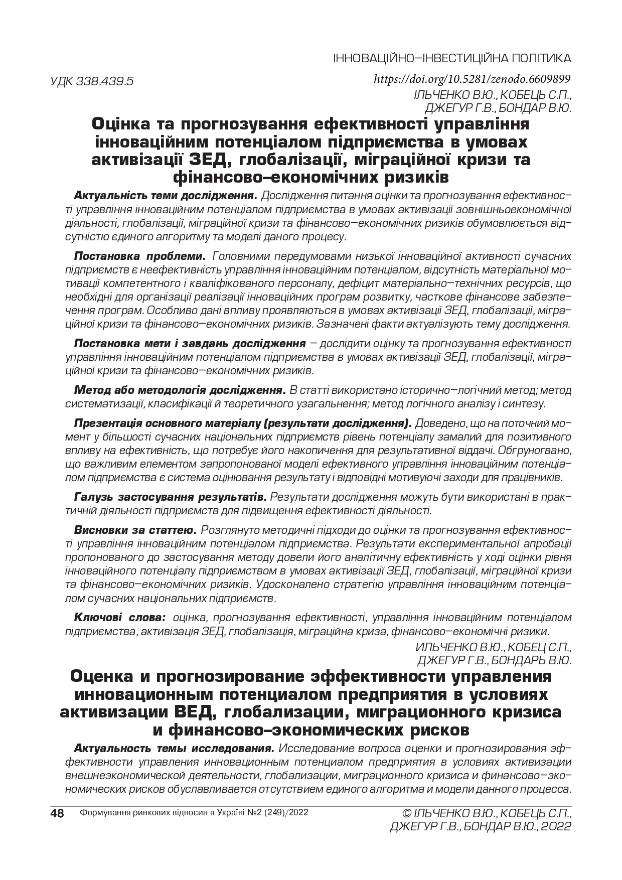 Оцінка та прогнозування ефективності управління інноваційним потенціалом підприємства в умовах активізації ЗЕД, глобалізації, міграційної кризи та фінансово-економічних ризиків