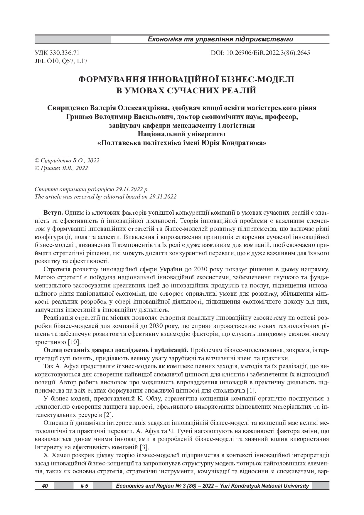 Формування інноваційної бізнес-моделі в умовах сучасних реалій