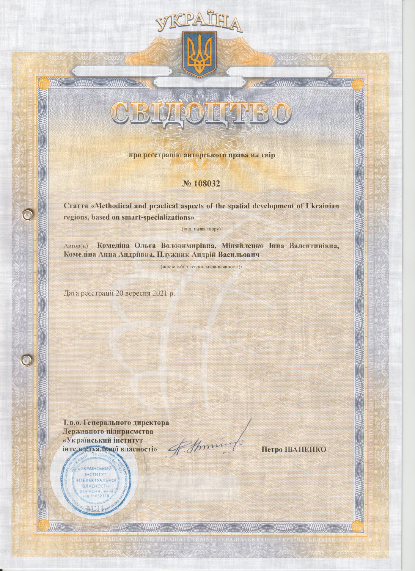 Свідоцтво про реєстрацію авторського права № 108032 на твір «Methodical and Practical Aspects of the Spatial Development of Ukrainian Regions, Based on Smart-specializations»