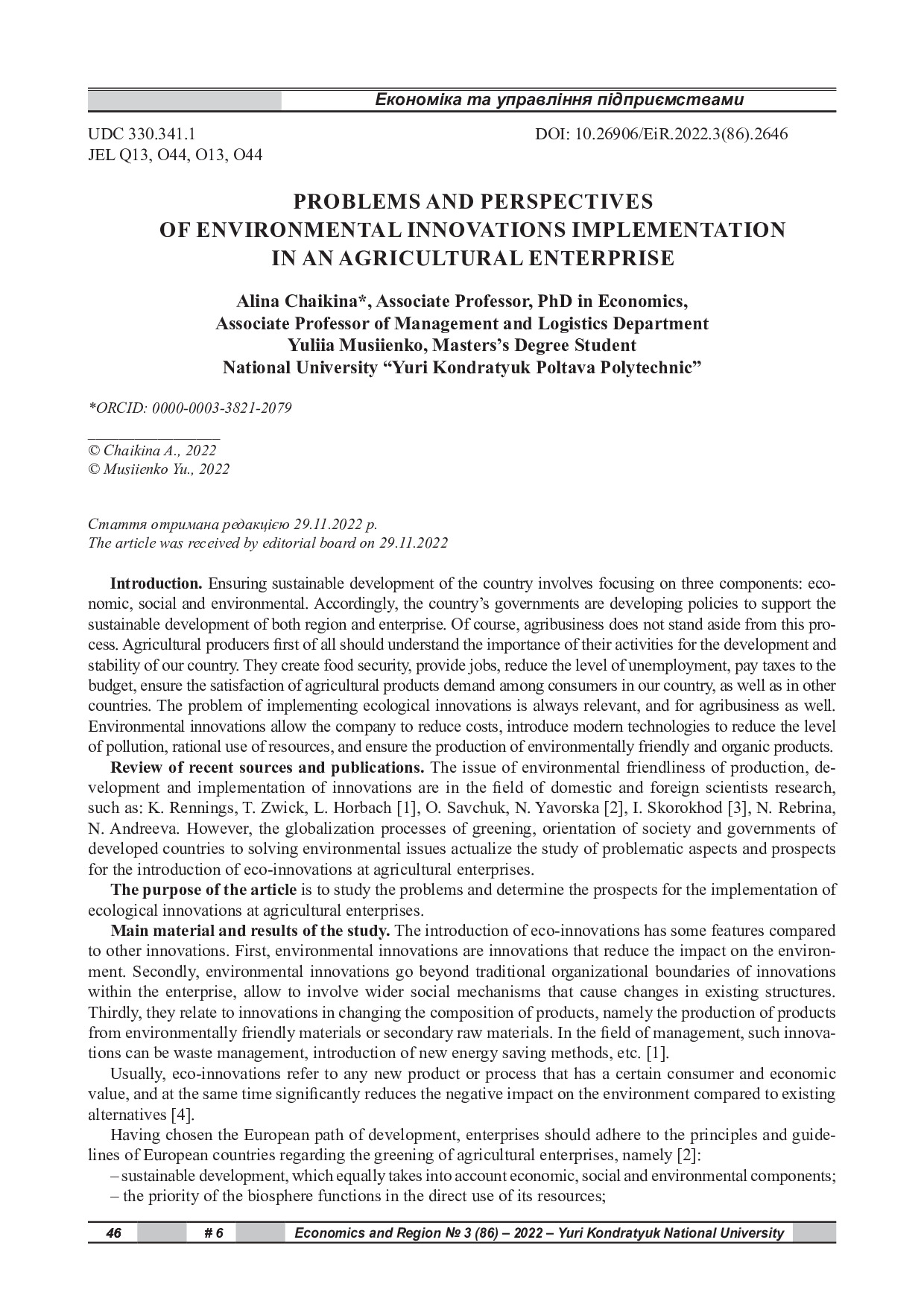 Chaikina A. Problems and perspectives of environmental innovations implementation in an agricultural enterprise / A. Chaikina, Y. Musiienko // Економіка і регіон. – 2022. – № 3 (86). – С. 46–50. – DOI: 10.26906/EiR.2022.3(86).2646.