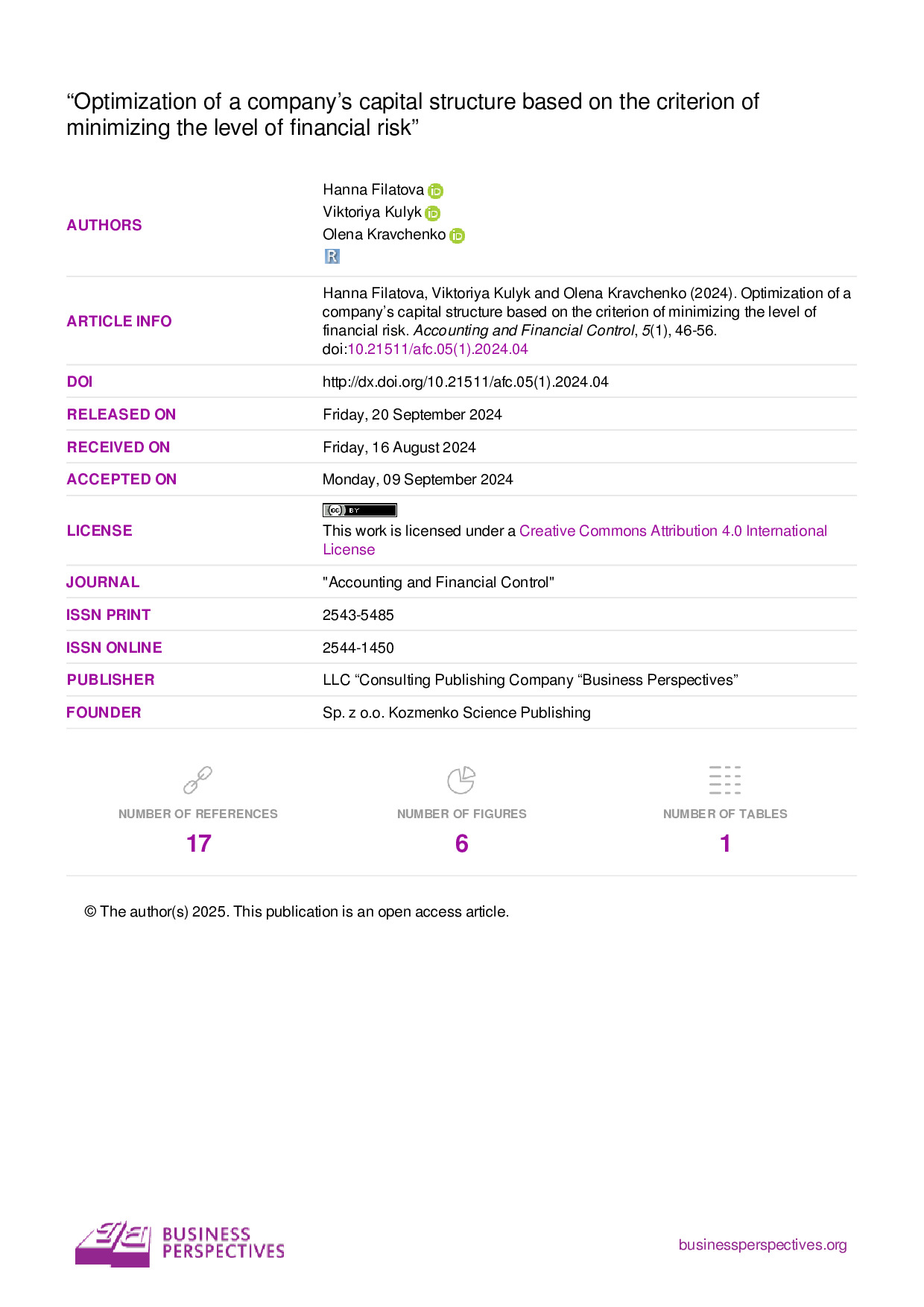 Filatova H. Optimization of a company’s capital structure based on the criterion of minimizing the level of financial risk / Hanna Filatova, Viktoriya Kulyk, Olena Kravchenko // Accounting and Financial Control. – 2024. – Vol. 5, Iss. 1. – P. 46–56. – http://dx.doi.org/10.21511/afc.05(1).2024.04