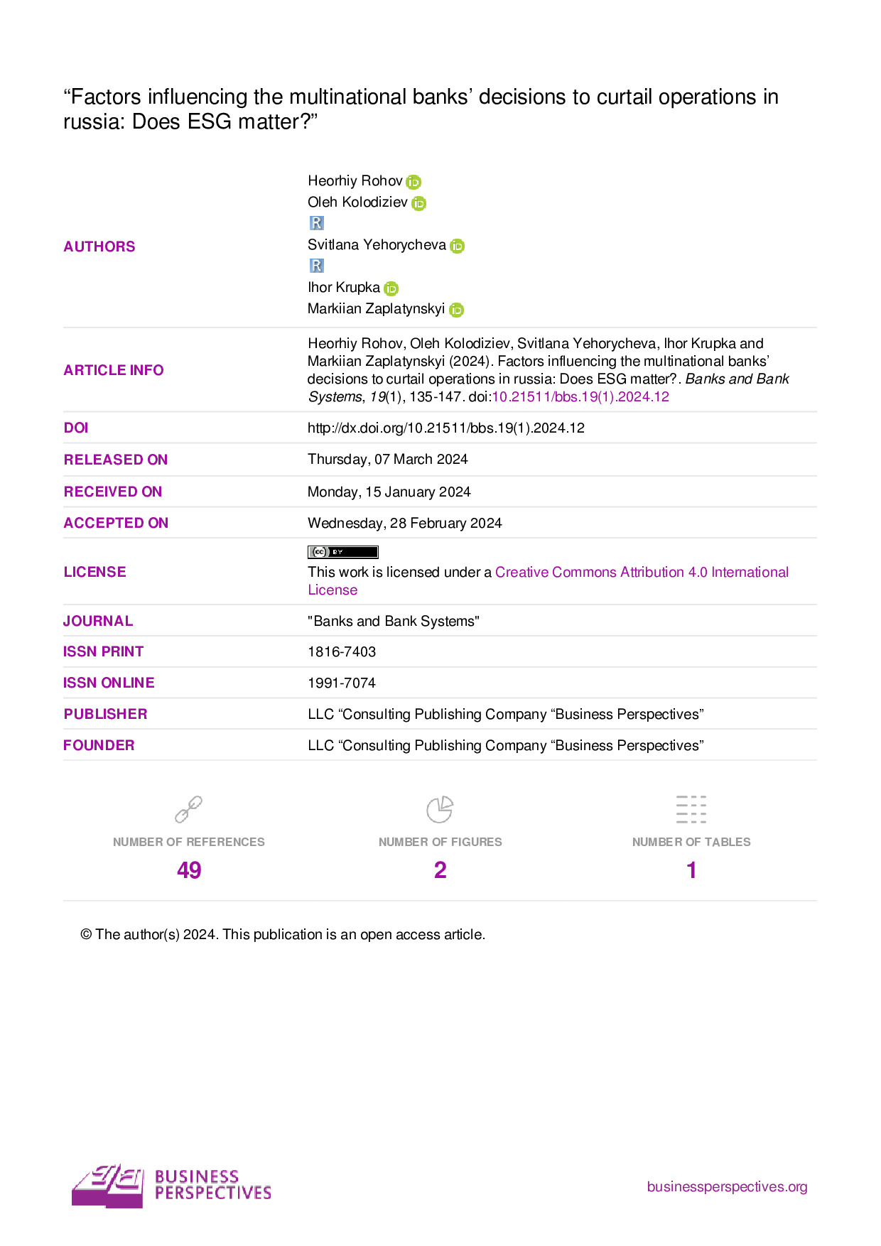 Factors influencing the multinational banks’ decisions to curtail operations in russia: Does ESG matter? / Heorhiy Rohov, Oleh Kolodiziev, Svitlana Yehorycheva, Ihor Krupka, Markiian Zaplatynskyi // Banks and Bank Systems. – 2024. – Vol.19, Iss.1. – P. 135-147.