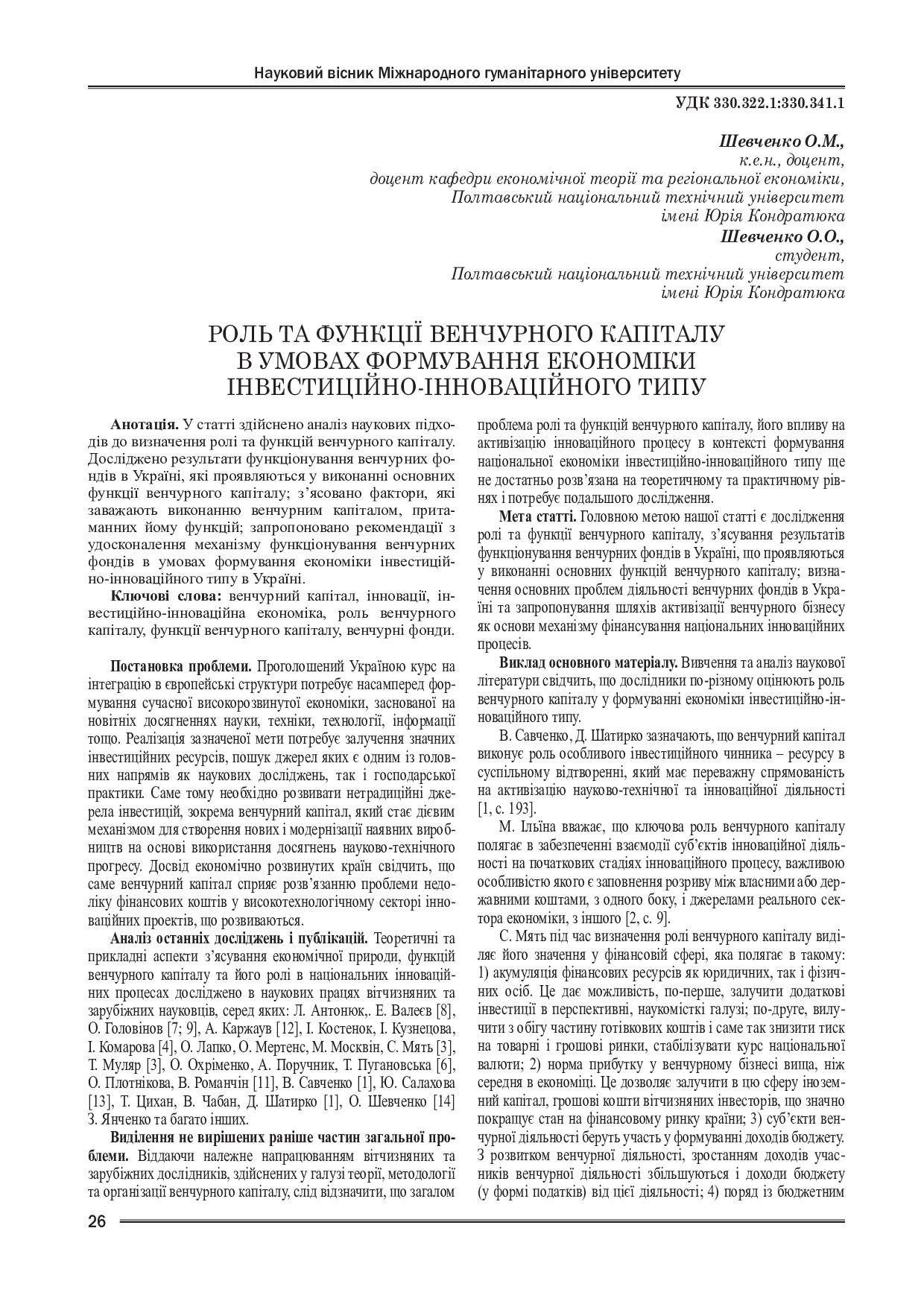 Роль та функції венчурного капіталу в умовах формування економіки інвестиційно-інноваційного типу